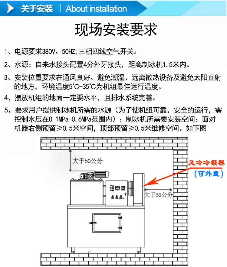 小型片冰機(jī)一般都是一體式風(fēng)冷片冰機(jī),這種小型片冰機(jī)安裝簡單(客戶自己現(xiàn)場接水接電就可以開機(jī)制冰)操作簡單(一鍵開機(jī)自動(dòng)制冰出冰)機(jī)器操作安全可靠(機(jī)器全自動(dòng)控制,如有故障片冰機(jī)立馬停機(jī)保護(hù))片冰制冰機(jī)安裝環(huán)境要求不高(機(jī)器所需占地面積非常小,只要通風(fēng)環(huán)境好點(diǎn)就行)。小型片冰機(jī)現(xiàn)場安裝示意圖如下