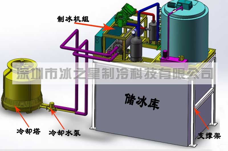 大型片冰機(jī)的冷卻方式一般為水冷方式,需要在安裝現(xiàn)場對冷卻水塔、冷卻水泵及儲(chǔ)冰庫進(jìn)行安裝,這個(gè)需要專業(yè)安裝師傅進(jìn)行現(xiàn)場安裝或指導(dǎo)安裝。大型片冰機(jī)安裝示意圖如下