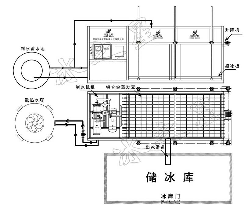 F、脫冰迅速快:水凍結成冰后,制冰系統(tǒng)反向加熱,熱氟進入蒸發(fā)器脫冰,脫冰速度快;脫冰后直接落在冰輸送裝置上,無需行車等取吊設備;